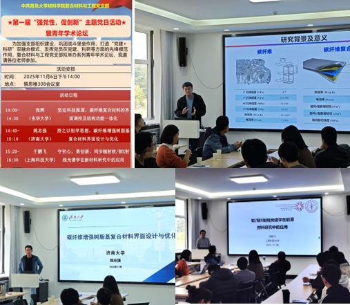 为加强支部组织建设,巩固战斗堡垒作用,打造“党建+科研”双融合模式,发挥党员在党建、科研等方面的先锋模范作用,2025年11月6日下午,复合材料与工程党支部联合山东省可再生膜重点实验室、智能材料与结构专业在慎思楼308会议室,开展了第一届“强党性,促创新”主题党日暨青年学术沙龙活动。活动由复合材料与工程党支部书记袁华同志主持,60多名师生现场参与。