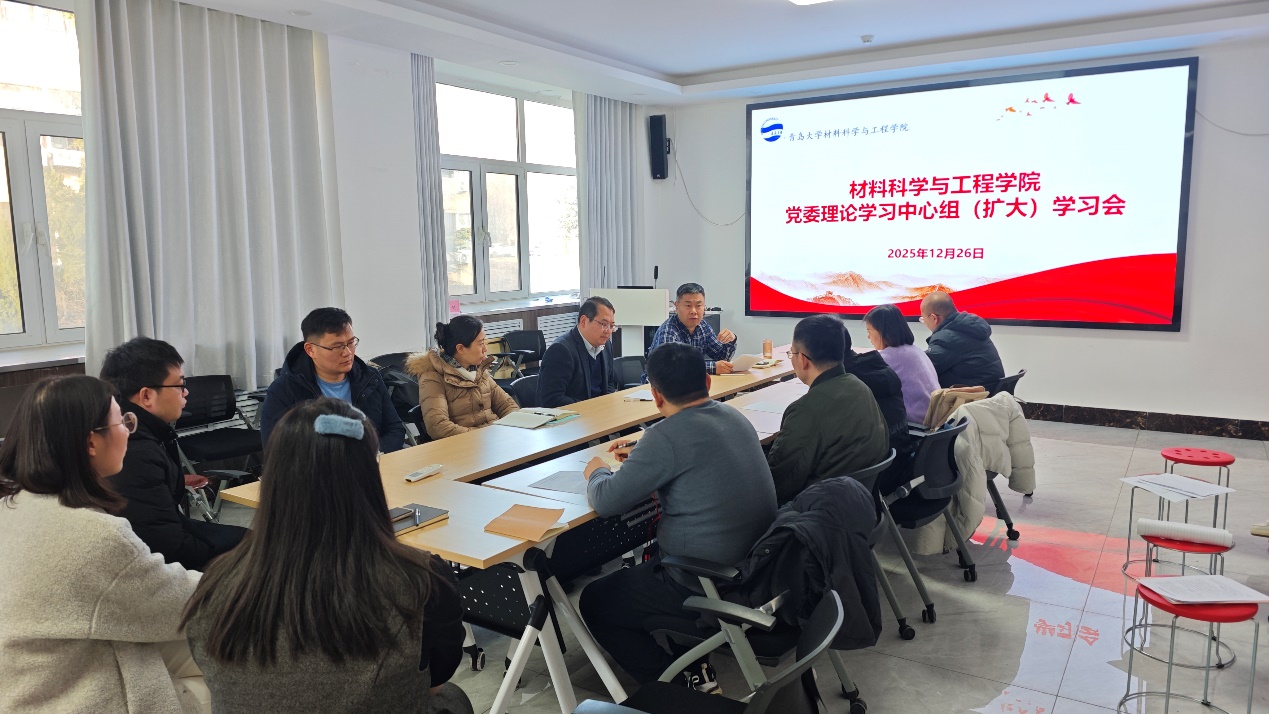 2025年12月26日下午,材料科学与工程学院党委理论学习中心组(扩大)在慎思楼308会议室开展集体学习研讨,深入学习领会党的二十届四中全会精神和审议通过的《中共中央关于制定国民经济和社会发展第十五个五年规划的建议》,研究学院贯彻落实重要举措。党委理论学习中心组成员及各系主任、党支部书记参加学习。