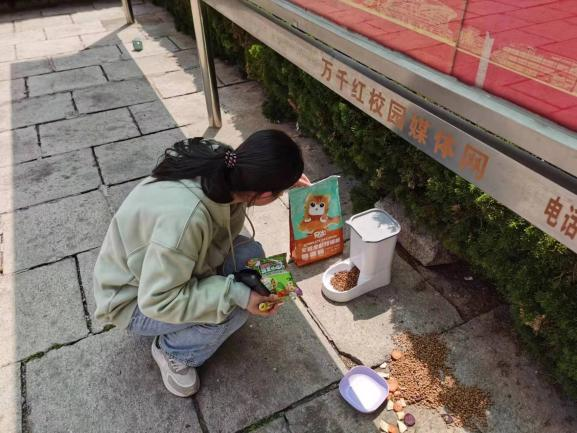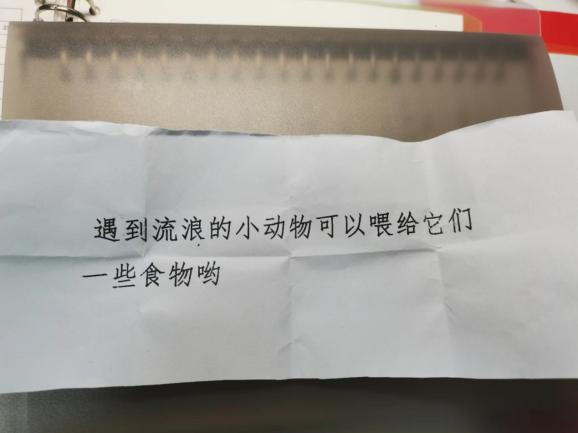 首先当抽到“遇到流浪的小动物可以喂给它们一些食物”的志愿任务时,我回想到了大一期间在学校社联志愿者部,我们被组织去给校内的流浪猫喂东西。当时我们通过多人在校园内寻找,发现了校内几处流浪猫常出没的地点。所以,当抽到这个任务时,我与朋友立马开始了志愿活动。我们在商店里买到了一些猫咪能吃的食物后,来到猫咪出没地,在它们的定点投喂餐盘中加了一些猫粮。虽然当时猫咪没有出现,但我们投喂的粮食应该可以防止猫咪挨饿。其次,当我们往回走时,在花坛里发现了一只生病的狗,我们给它喂了一些它能吃的食物。最后,我想说很开心能参与这次活动,我认为“动物是人类的朋友”,我们应该像对待朋友一样,关爱我们身边的小动物。同时,作为新时代青年,我们要争先锋,勇担当。呼吁大家积极参与爱护动物的志愿活动。——来自代同学