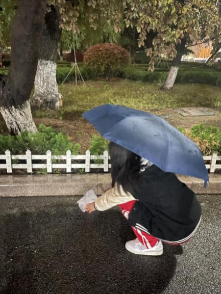 当我抽到“随手捡起一片垃圾”任务时,我再次思考这个看似简单的行为的意义:随手捡起一片垃圾,就可以维护好我们干净可爱的校园。一个行为建立起的是公共意识,我们弯腰的动作表达了对环境对校园的爱护。随手捡起一片垃圾,走在雨后的校园里,一切都是清新和明朗…——来自吴同学