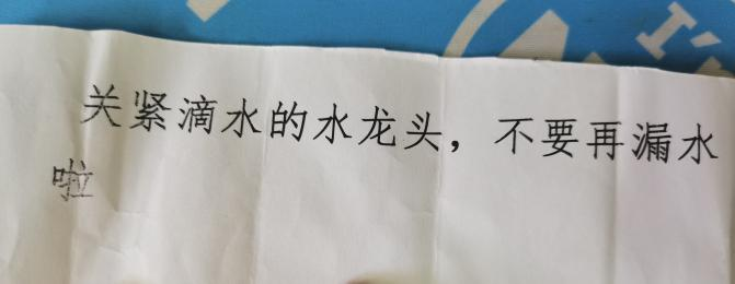 我抽到的任务是“随手关上未关闭的水龙头”这虽然看上去是一件小事,举手之劳而已,但却是节水的一大步。水资源的现状和问题非常严峻。全球可用水量比以往任何时候都少,可用的淡水比例更小,这使得许多地区的人们严重缺乏饮用水,很多国家的人口都面临着严重的水资源短缺。因此节约用水刻不容缓。缺水警钟长鸣,节水势在必行!恰华茂,争先锋,节约用水从我做起!——来自曹同学