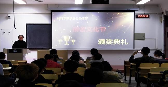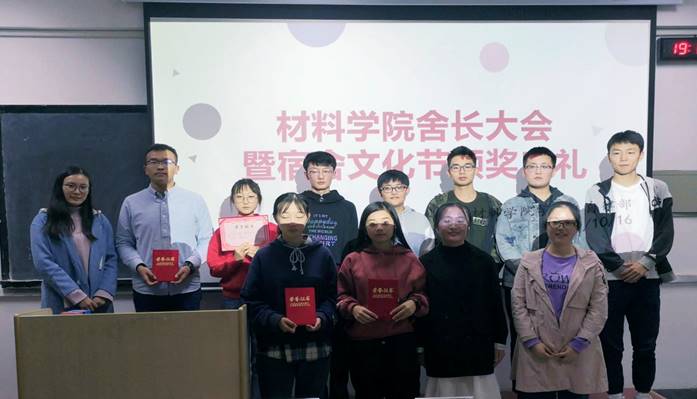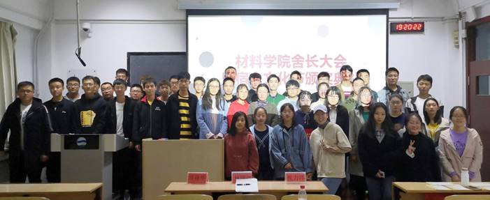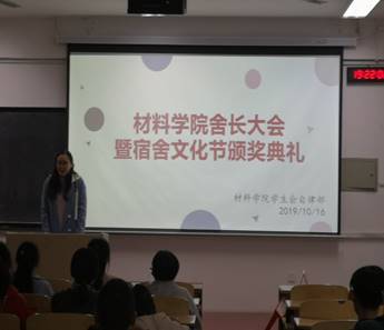 10月16日晚六点半在博学楼106教室举办了19级“舍长大会暨宿舍文化节颁奖典礼”。出席会议的有19级辅导员林国红老师,材料科学与工程学院学生会主席周泽华学长,副主席张力沣学长,以及19级全体舍长,会议由材料学院学生会自律部部长侯雨辰主持。