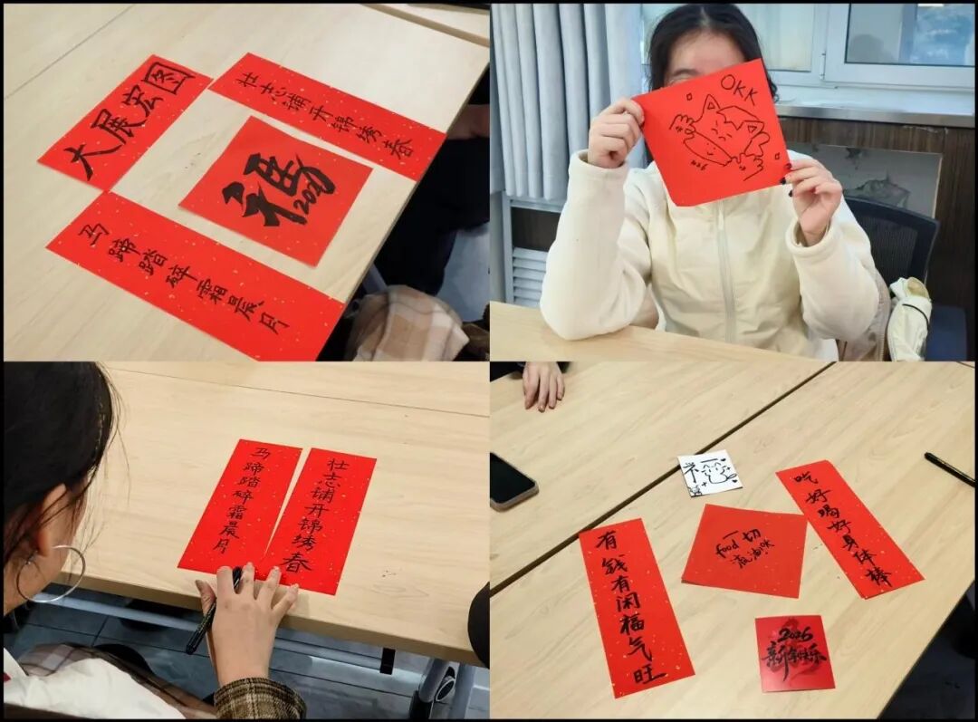 在欢快的气氛中,同学们自由挑选宣纸或贺卡,尽情挥洒创意。现场气氛热烈,同学们才思如泉涌,创作出了各式各样、内容丰富的作品,如别具一格的福字、新颖独特的贺卡、对仗工整的春联,可谓百花齐放,精彩纷呈。