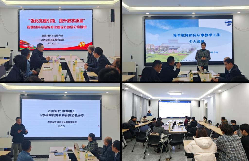 为深入落实立德树人根本任务,持续提升人才培养质量,助力青年教师发展,学院智能材料与结构系与复合材料与工程党支部于12年11日在慎思楼308会议室联合举办教学专题分享会。会议邀请青岛大学教务处副处长吕途教授、政治与公共管理学院刘方亮副教授作主题报告,学院党委书记张奎勤主持,师生代表五十余人参会。